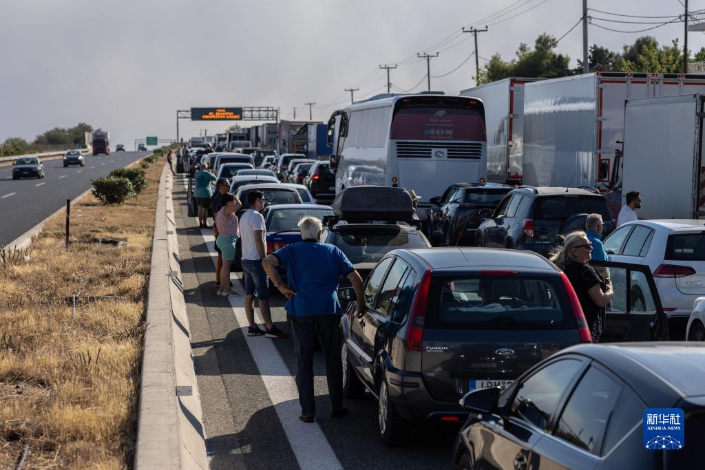 7月17日,在希臘雅典郊外盧特拉基附近的公路上,人們停下車(chē)等待通行。