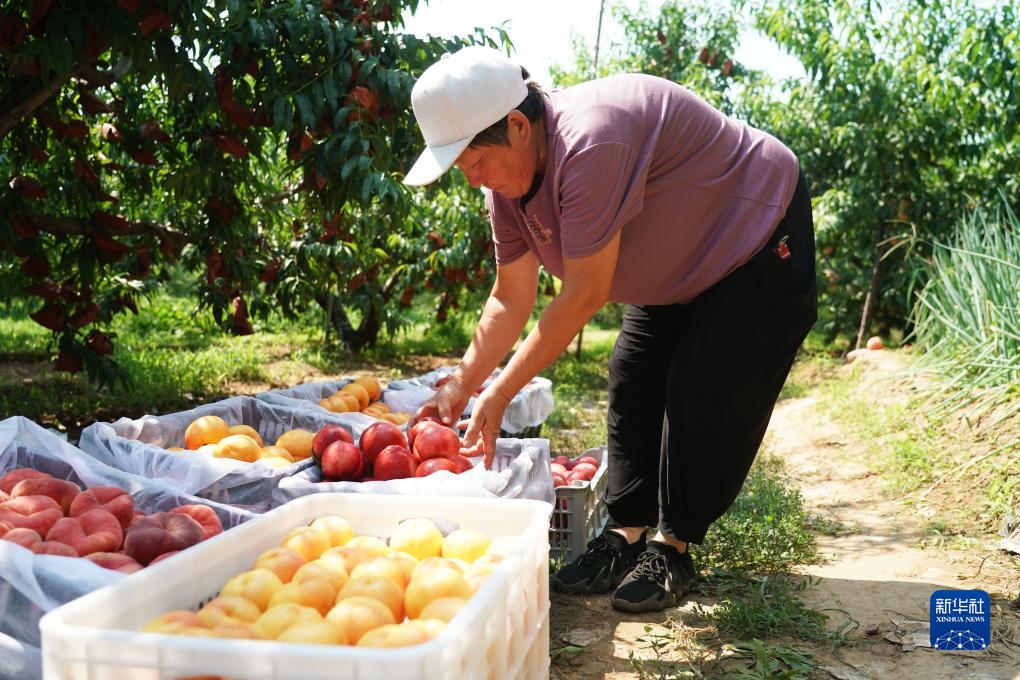 7月18日,在北京市平谷區大華山鎮的一處桃園,桃農整理采摘好的桃子。