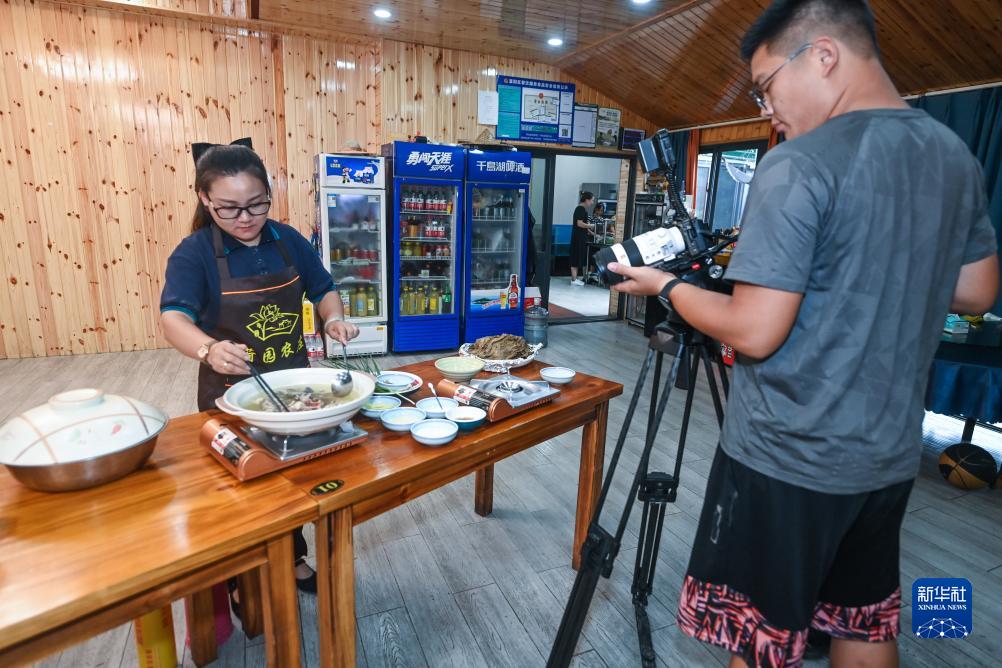 7月18日,在杭州富陽(yáng)廣吉生態(tài)農業(yè)基地內,新鄉賢周小芳(左)正在進(jìn)行電視專(zhuān)題片拍攝,推介當地特色美食。位于杭州市富陽(yáng)區銀湖街道坑西村的廣吉生態(tài)農業(yè)基地是由回歸的新鄉賢創(chuàng )辦,是一家集水產(chǎn)養殖、垂釣、餐飲、觀(guān)光于一體的農文旅休閑產(chǎn)業(yè)基地。