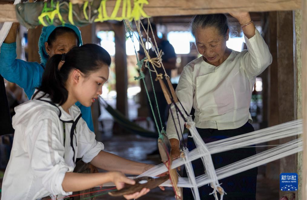 7月16日,依波逢的外婆(右)指導依波逢織布。