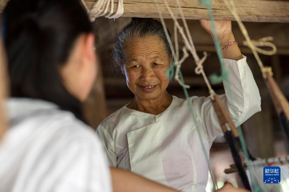 7月16日,依波逢的外婆(右)指導依波逢織布。