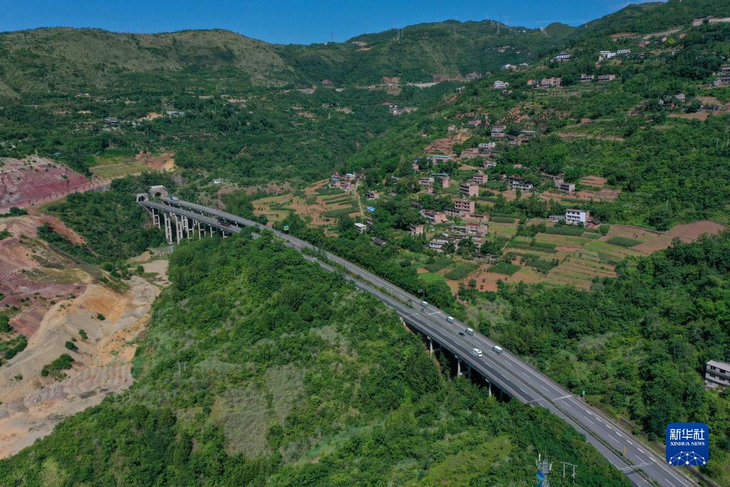 6月30日,在重慶市巫山縣境內,載著(zhù)巫山脆李的中國郵政物流車(chē)在高速公路上行駛(無(wú)人機照片)。