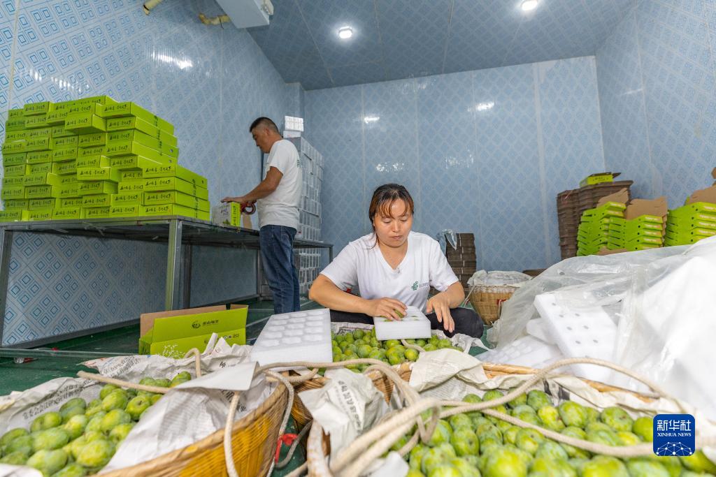 6月28日,在重慶市巫山縣曲尺鄉柑園村的脆李分揀中心,郵政工作人員在打包巫山脆李。