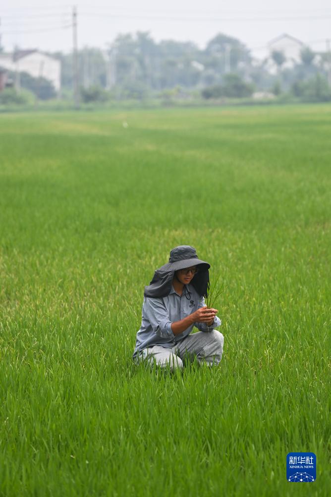 7月19日,在湖州市東林鎮保永村,種糧大戶(hù)查看水稻的長(cháng)勢。