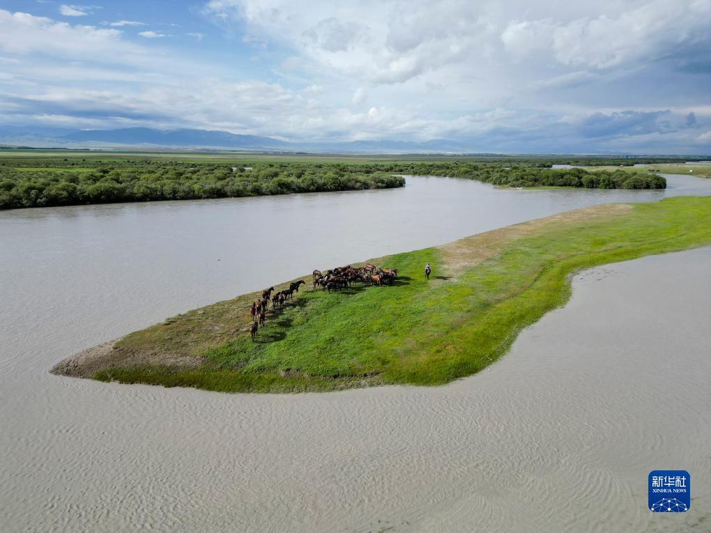 這是7月17日在新疆伊犁哈薩克自治州昭蘇縣濕地公園景區拍攝的馬群(無(wú)人機照片)。
