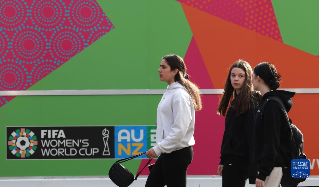 7月19日,人們從澳大利亞墨爾本矩形球場(chǎng)外的2023女足世界杯標識前經(jīng)過(guò)。