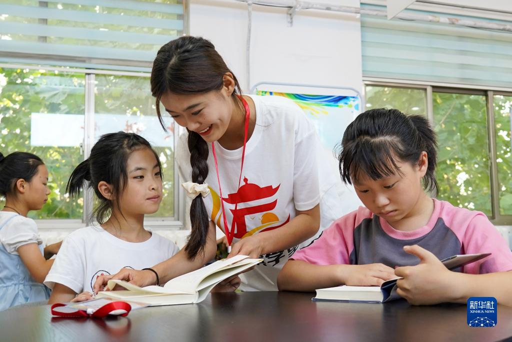 7月18日,在無(wú)棣縣棣豐街道星湖社區服務(wù)中心,返鄉大學(xué)生志愿者輔導孩子閱讀。
