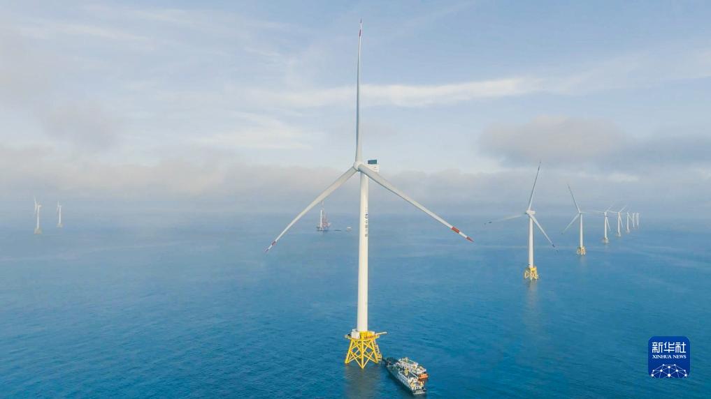 這是在三峽集團福建海上風(fēng)電場(chǎng)成功并網(wǎng)發(fā)電的16兆瓦超大容量海上風(fēng)電機組(無(wú)人機照片,7月19日攝)。