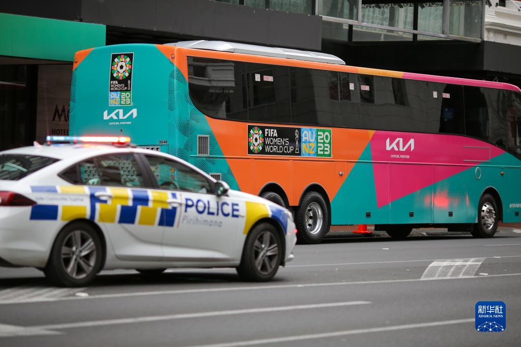 7月20日,在新西蘭奧克蘭,警車(chē)經(jīng)過(guò)一輛女足世界杯專(zhuān)用巴士。