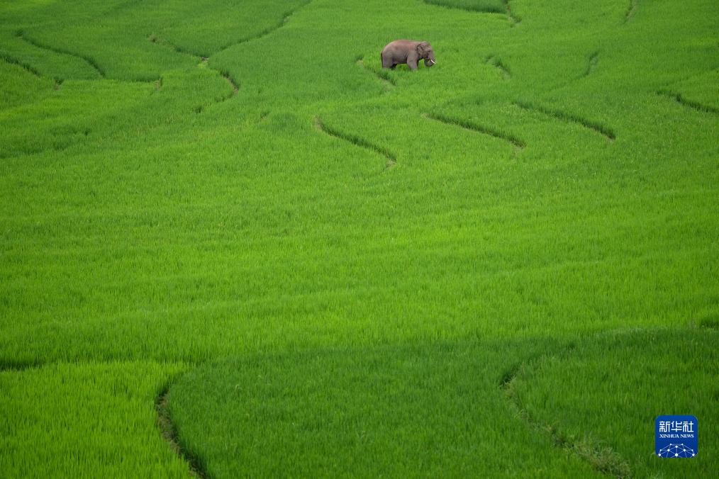 7月19日,一頭被叫做“大缺耳朵”的雄性亞洲象在稻田中“大快朵頤”。