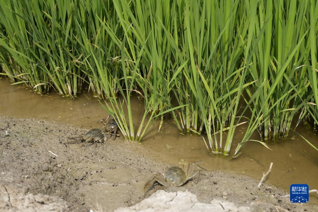 河北省唐山市豐南區黑沿子鎮一處由鹽堿地改良而成的稻漁綜合種養試點(diǎn)區內的稻田蟹(7月20日攝)。