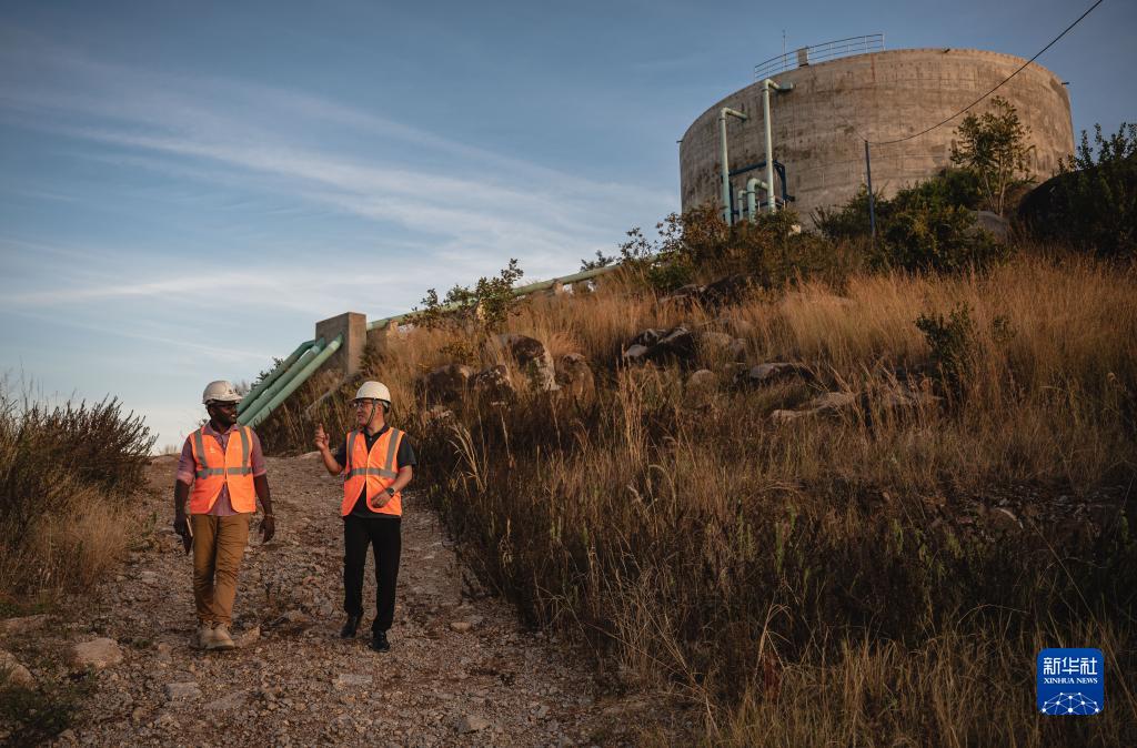 6月12日,凱爾文(左)在坦桑尼亞姆萬(wàn)扎省布斯韋盧供水項目高位蓄水池旁與同事交流。