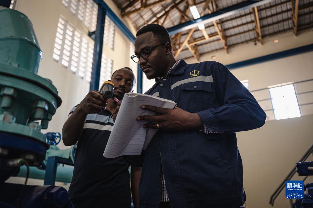 6月11日,在坦桑尼亞姆萬(wàn)扎省奇塞凱,凱爾文(右)在供水項目增壓泵站內記錄水泵工作情況。