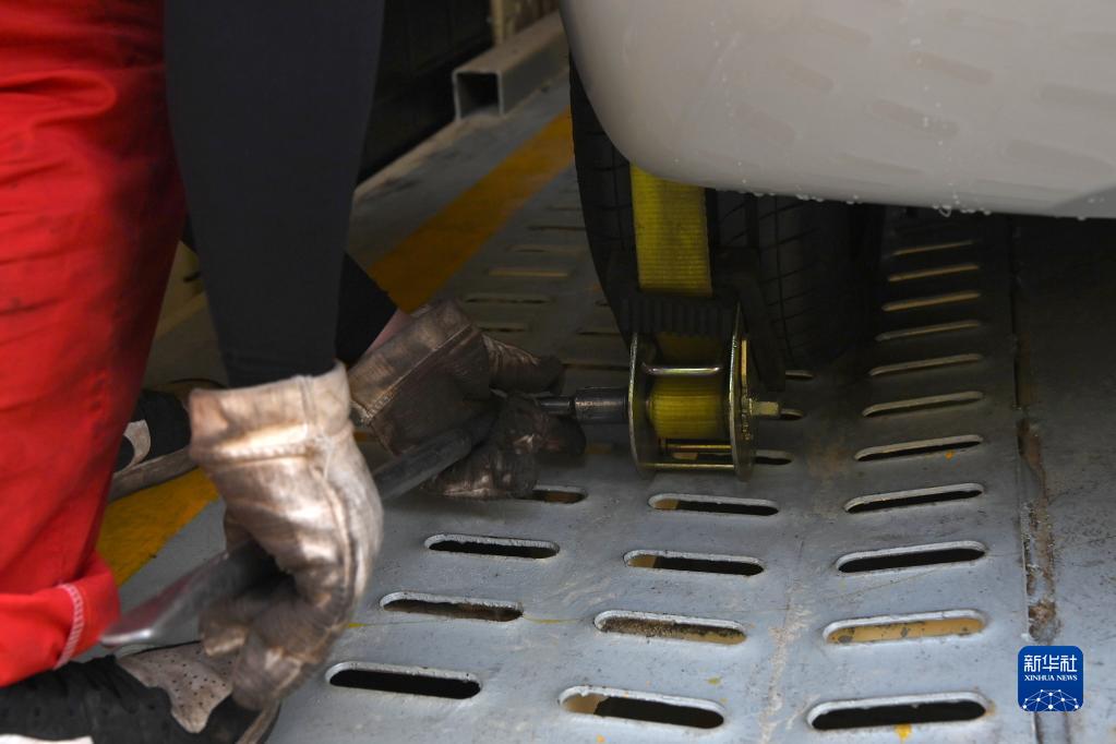 在廣西柳州雒容汽車(chē)物流基地,身著(zhù)橘色制服的駕駛員嫻熟地駕駛著(zhù)一輛輛小汽車(chē)在貨運列車(chē)車(chē)廂內行駛。到達指定位置停車(chē)后,駕駛員用緊固帶對車(chē)輪進(jìn)行固定,完成裝載。