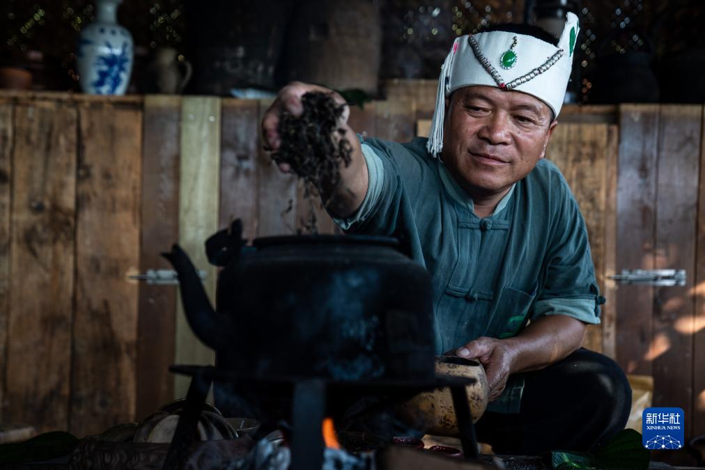 在瀾滄縣惠民鎮,布朗族茶農南康在火塘邊做烤茶(7月18日攝)。