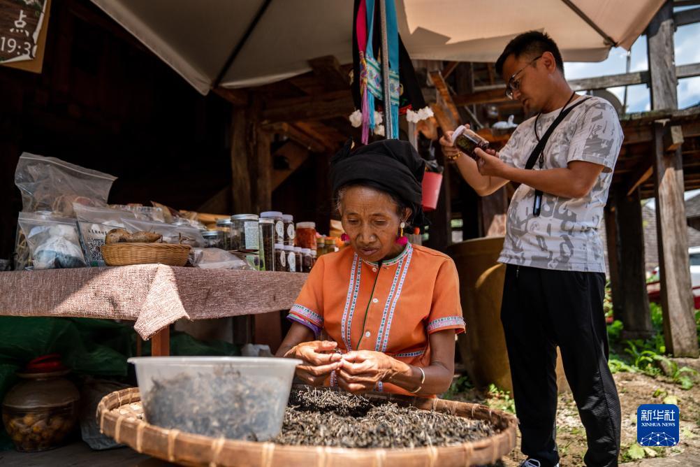 在瀾滄縣惠民鎮翁基古寨,一名布朗族婦女在挑揀茶葉(7月18日攝)。