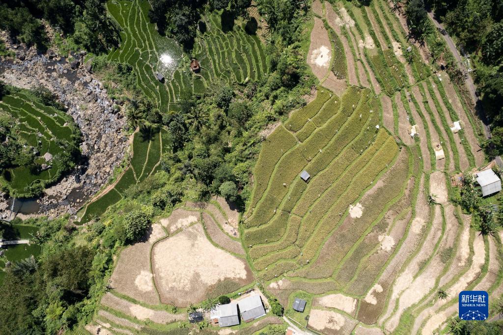 這是7月20日在印度尼西亞西爪哇省茂物地區的鄉間拍攝的稻田(無(wú)人機照片)。當前正值稻米收獲季。