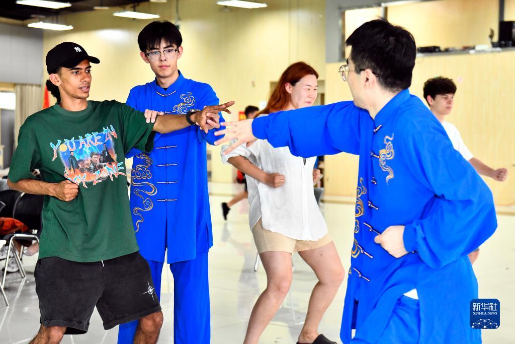 7月20日,在中國石油大學(xué)(華東)沉浸式中醫藥文化體驗中心,黃島區中醫醫院的醫護人員教留學(xué)生學(xué)習八段錦。