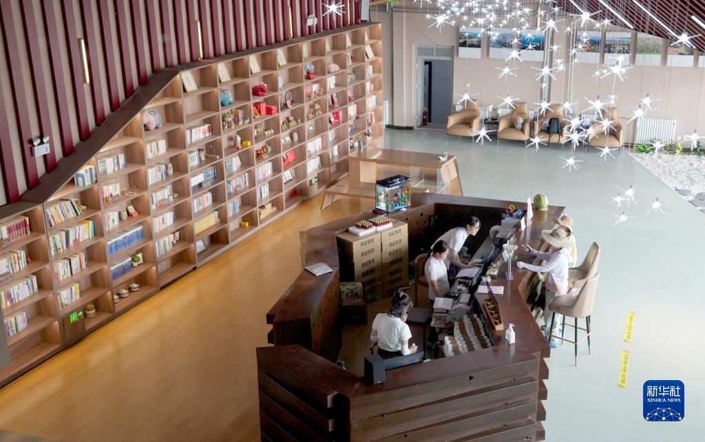 7月20日,工作人員在沙漠圖書(shū)館大廳給游客辦理借書(shū)。