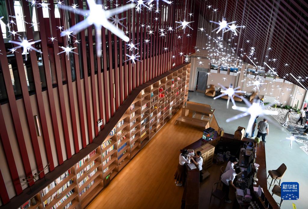 7月20日在寧夏中衛市騰格里沙漠大漠星河度假區拍攝的沙漠圖書(shū)館大廳。