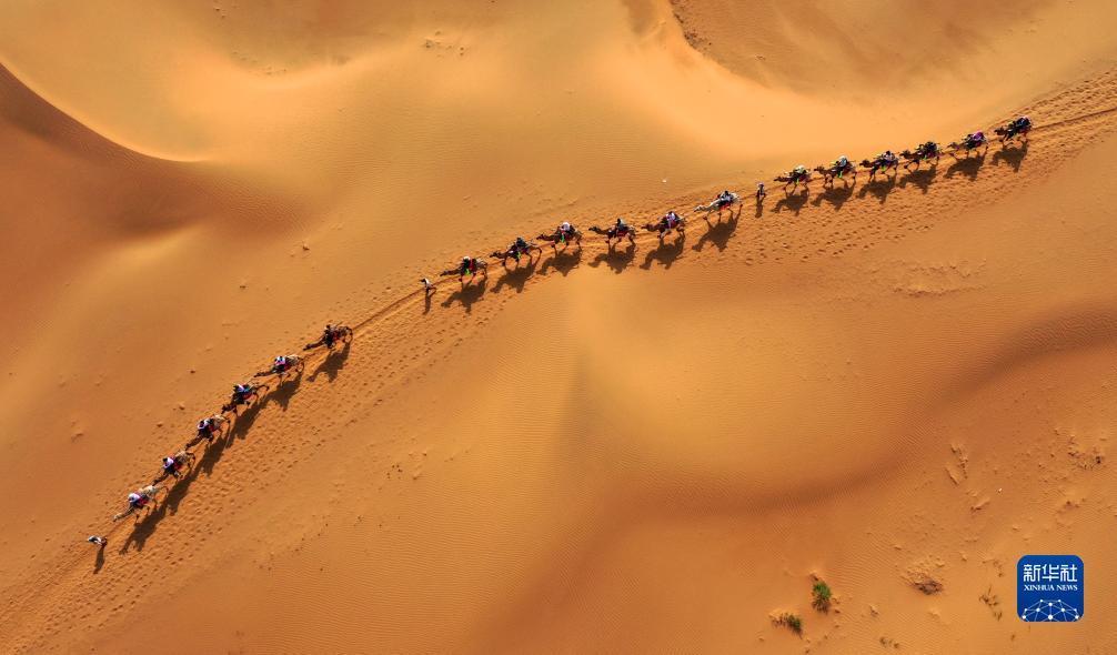 7月20日,游客在寧夏中衛市沙坡頭景區體驗沙漠騎駱駝(無(wú)人機照片)。
