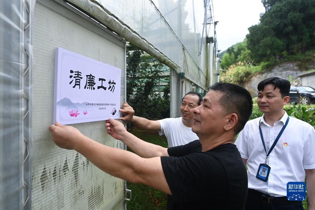 7月21日,在杭州市臨安區錦南街道上甘村綠明農業(yè)種植基地內,負責人將街道授予的“清廉工坊”牌子掛在大棚門(mén)口。錦南街道街道紀工委聯(lián)合街道區域發(fā)展辦,組建“共富工坊”專(zhuān)項監管小組,對各個(gè)共富工坊的日常運行、資金流動(dòng)、工資支付等方面采取不定期實(shí)地查驗,及時(shí)掌握“共富工坊”的運行動(dòng)態(tài),并為運行透明有效的工坊授予“清廉工坊”榮譽(yù)稱(chēng)號。