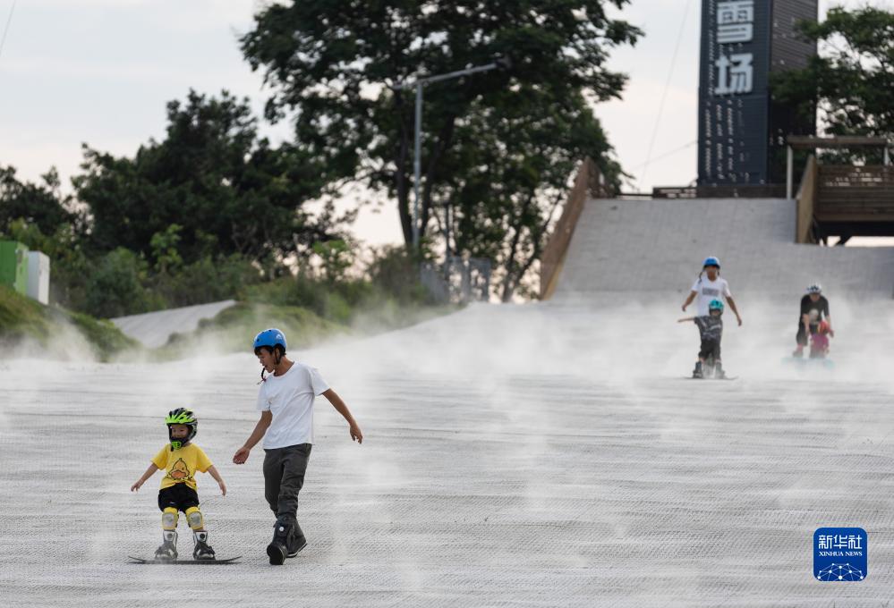 在成都美洲時(shí)尚體育公園,小朋友在教練的輔導下練習滑雪(7月18日攝)。