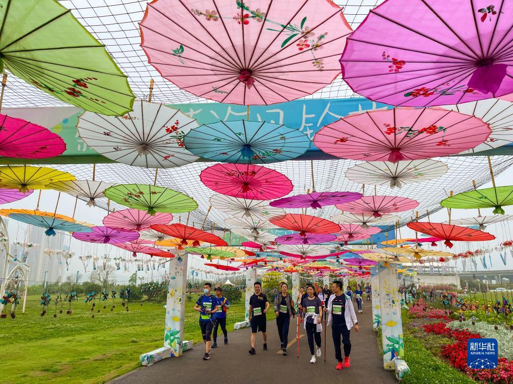 人們在成都綠道上參加徒步活動(dòng)(2021年5月22日攝)。