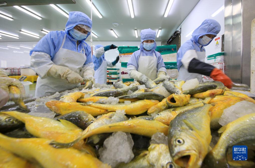 在寧德金盛水產(chǎn)生產(chǎn)車(chē)間,工人們加工大黃魚(yú)產(chǎn)品。這里每天大黃魚(yú)加工量達1.5至2萬(wàn)尾(5月12日攝)。