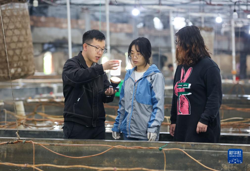 在寧德泩泩漁業(yè)育苗場(chǎng),廈門(mén)大學(xué)徐鵬教授團隊駐場(chǎng)博士(中、右)向育苗場(chǎng)負責人了解大黃魚(yú)實(shí)驗苗培養情況(5月9日攝)。一代又一代人的科技接力,讓大黃魚(yú)越“游”越強健。