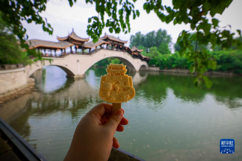 這是7月20日在山東省棗莊市臺兒莊古城拍攝古建筑造型文創(chuàng )雪糕。