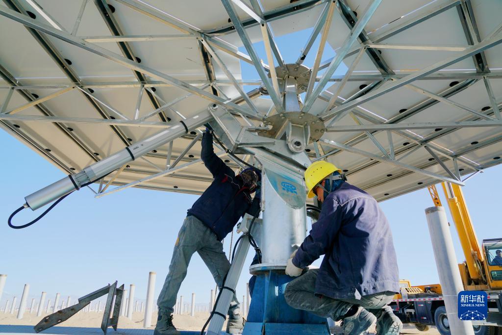 7月21日,在阿克塞千萬(wàn)千瓦級可再生能源多能互補基地,工人在匯東新能源75萬(wàn)千瓦光熱+項目建設現場(chǎng)安裝定日鏡。