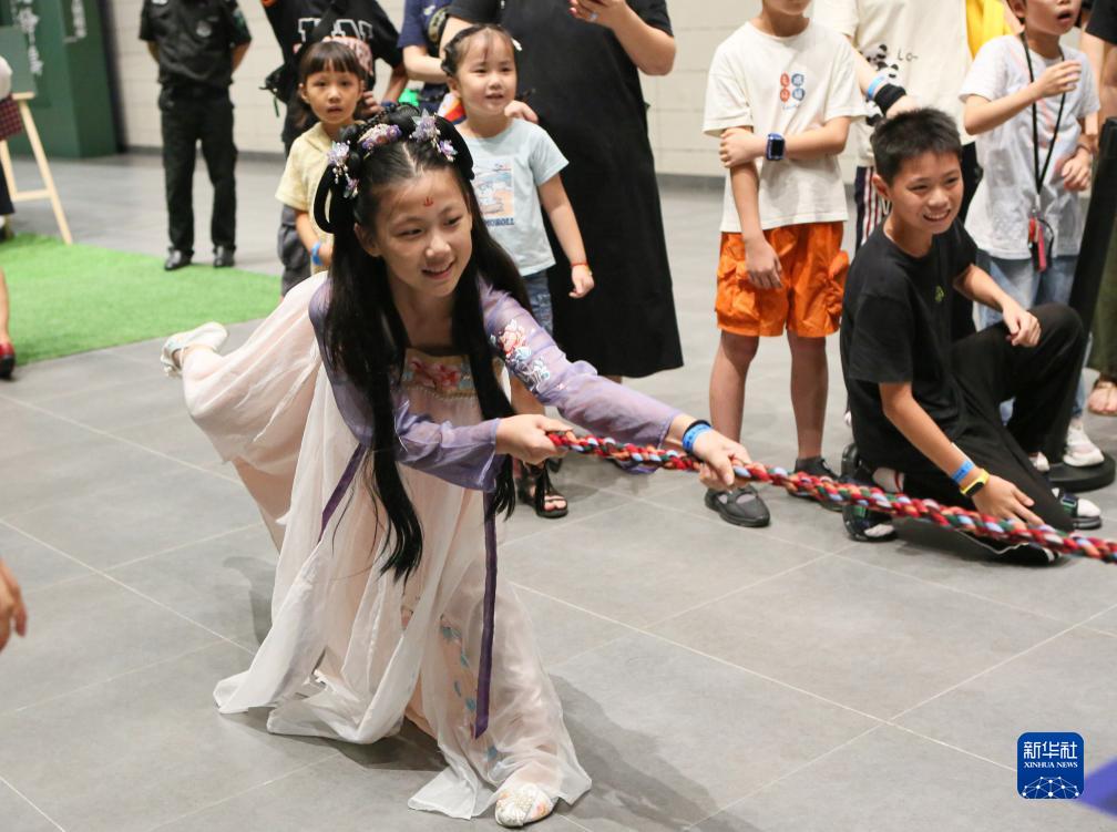 7月21日晚,小朋友在夜間“那達慕”大會(huì )上體驗拔河。