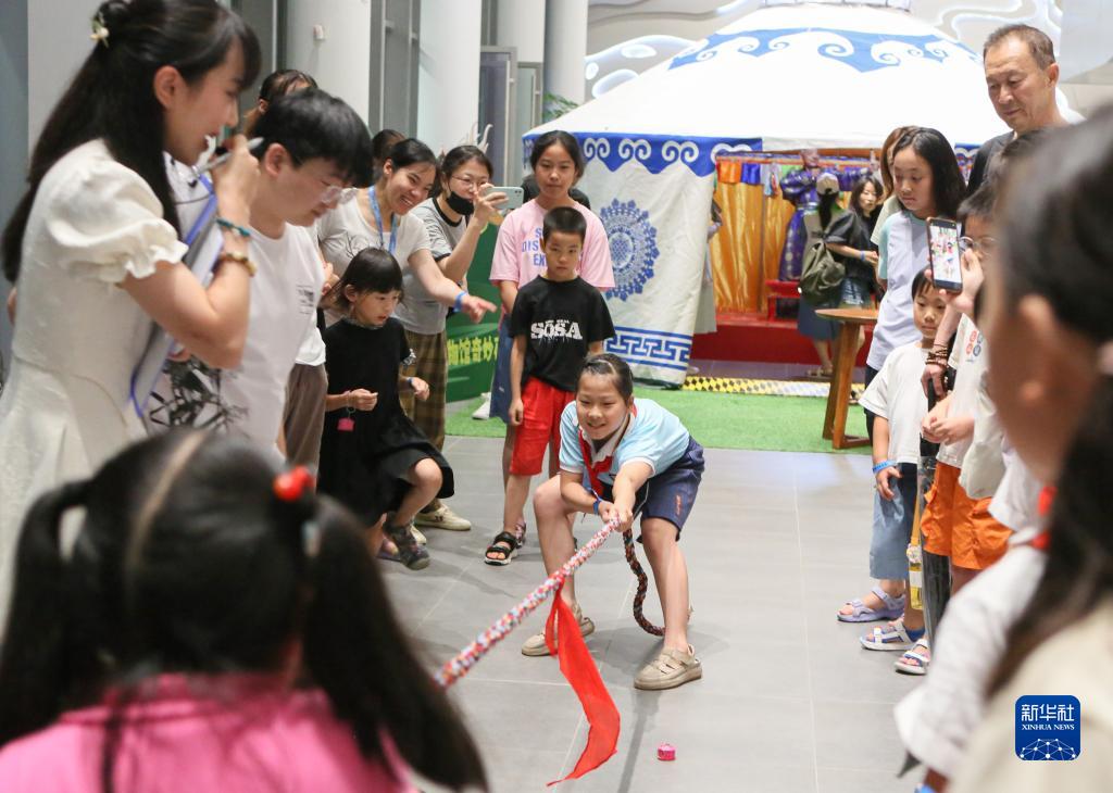 7月21日晚,小朋友在夜間“那達慕”大會(huì )上體驗拔河。