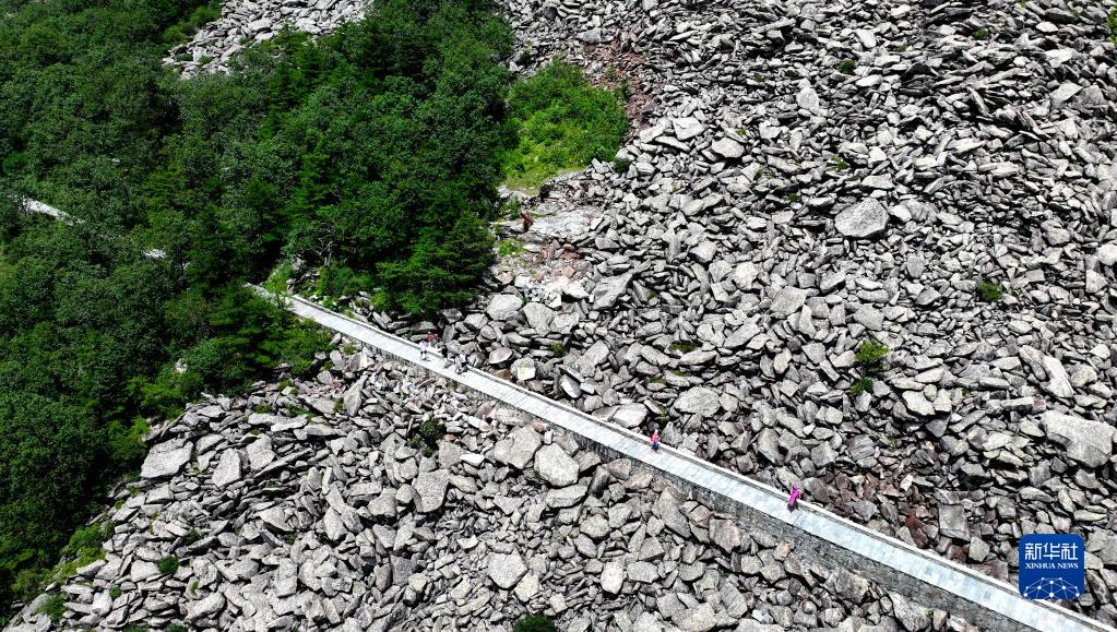 游人經(jīng)過(guò)陜西朱雀國家森林公園內的石海(7月21日攝,無(wú)人機照片)。