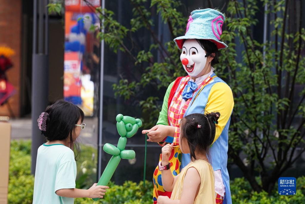 7月21日,在安徽省合肥市瑤海區車(chē)橋新界文創(chuàng )街區,馬戲團成員與小朋友互動(dòng)。