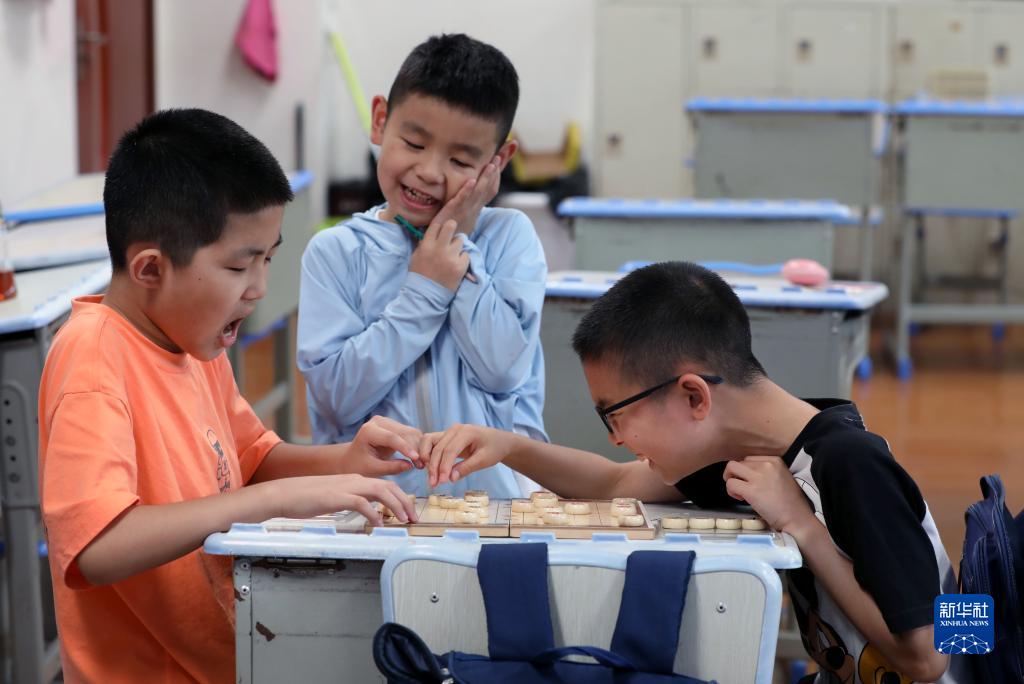 7月19日,在小學(xué)生愛(ài)心暑托班“新業(yè)態(tài)新就業(yè)群體子女專(zhuān)班”,從湖北襄樊來(lái)上海過(guò)暑假的“小候鳥(niǎo)”高智明(左)和小伙伴們下棋。