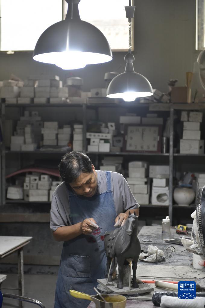 7月19日,在南石山村一家生產(chǎn)企業(yè)的車(chē)間里,唐三彩藝人高順旺在雕刻泥胎。