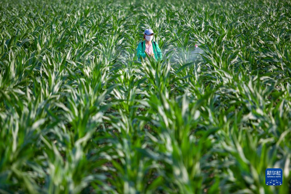 7月22日,在山東省淄博市高青縣黑里寨鎮,農民為玉米進(jìn)行植保作業(yè)。
