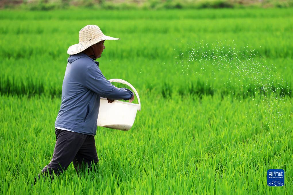 7月22日,在山東省臨沂市郯城縣郯城街道,農民為水稻施肥。