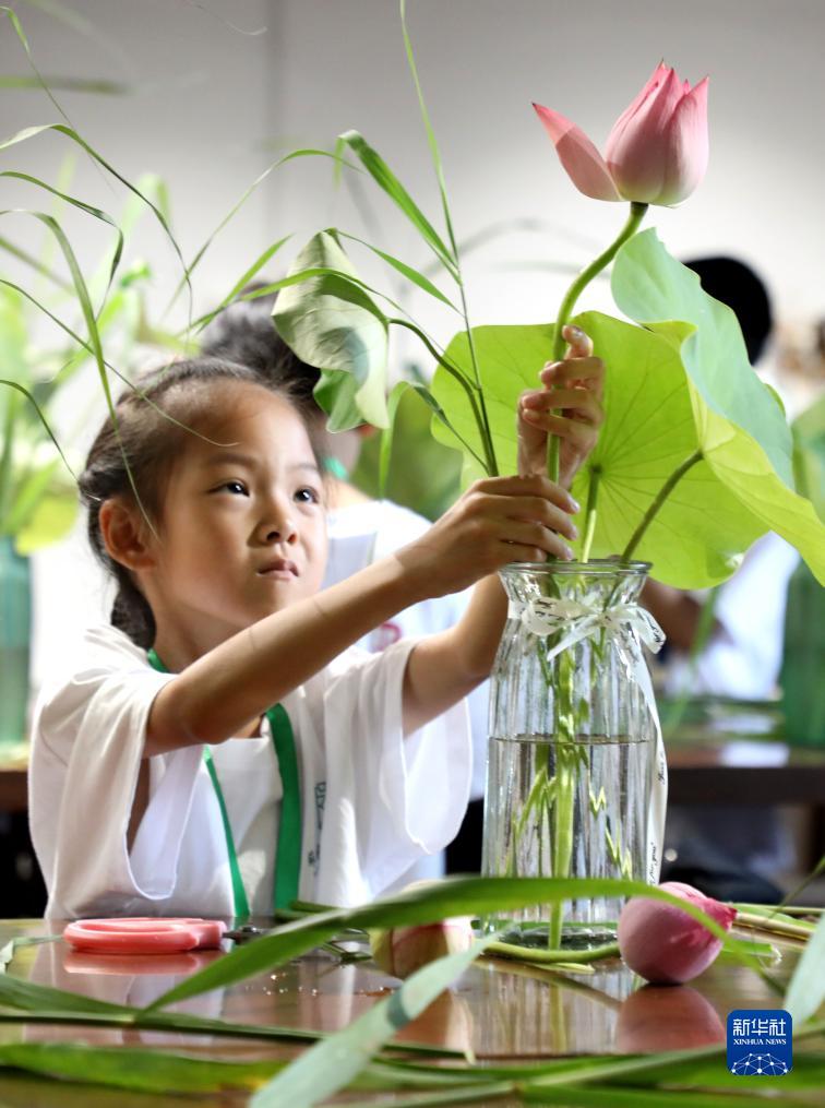 7月22日,在江蘇蘇州園林博物館,一名小朋友在體驗夏荷插花。