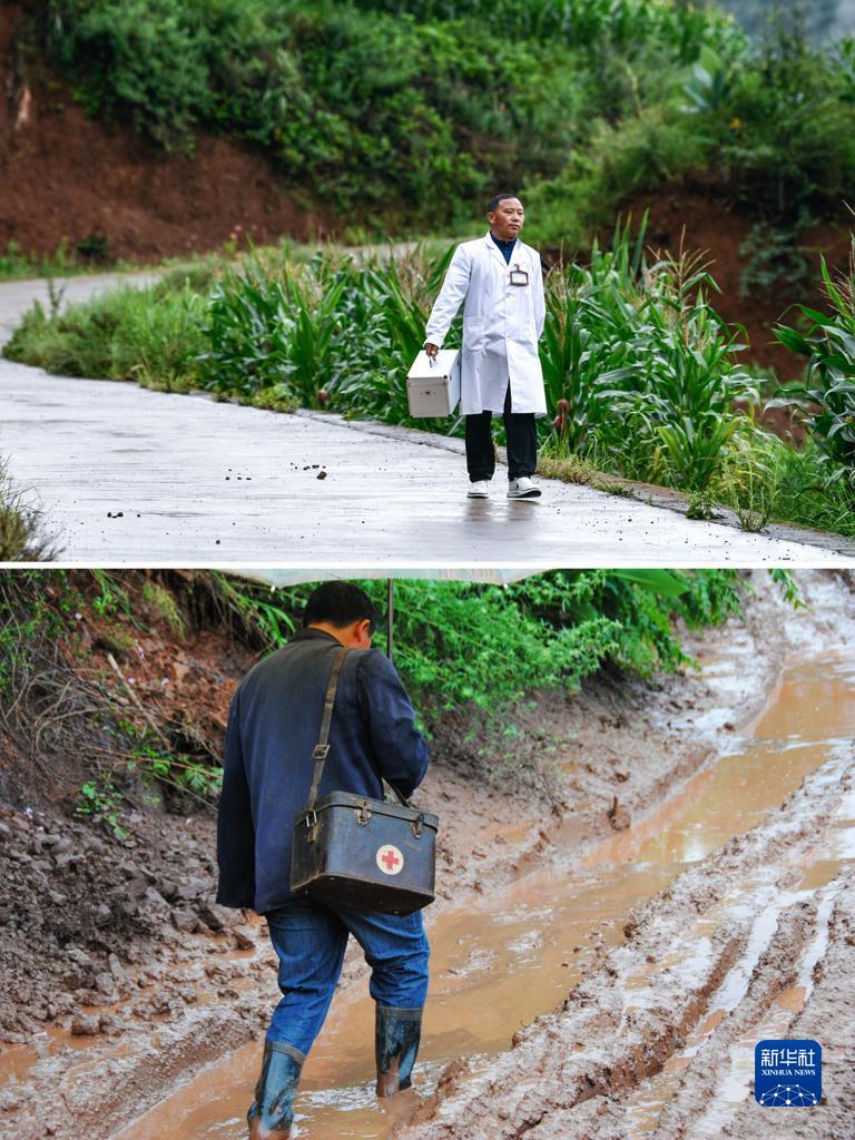這是一張拼版照片,上圖為:2023年7月19日,朱大清出診時(shí)走在寬敞的水泥路上;下圖為:2012年7月4日,朱大清出診時(shí)走在泥濘的山路上。