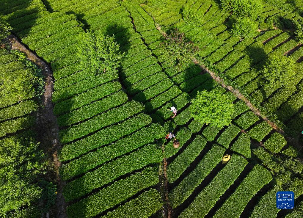 7月23日,湖北省宜昌市秭歸縣茅坪鎮松樹(shù)坳村的村民在茶園里采摘夏茶(無(wú)人機照片)。