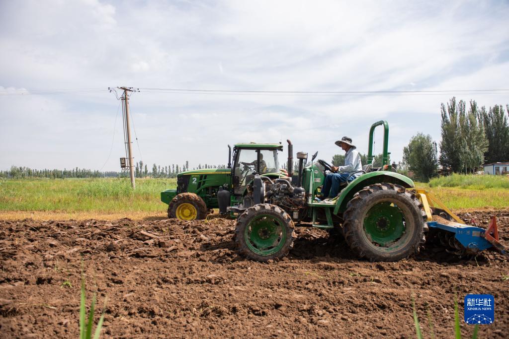 7月23日,在寧夏青銅峽市蔣南村,農民操作機械在田間作業(yè)。