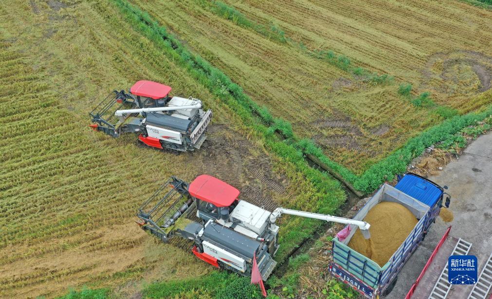 7月23日,浙江省臺州市仙居縣白塔鎮,農民將收割的稻谷裝車(chē)(無(wú)人機照片)。