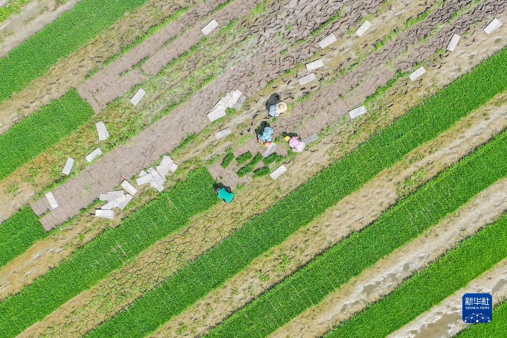 7月23日,湖南省永州市藍山縣雷家嶺村,村民在田間起秧苗(無(wú)人機照片)。