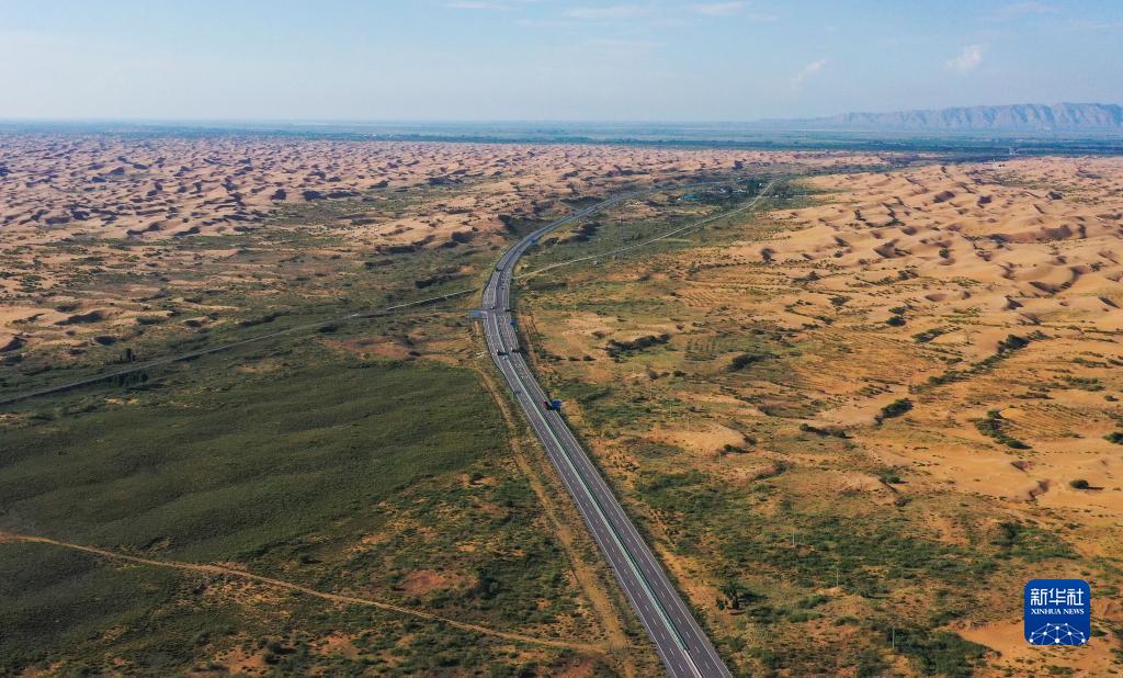 夏日時(shí)節,內蒙古自治區杭錦旗境內的穿沙公路綠意盎然,綠色沿著(zhù)道路前行,并向兩旁的沙地鋪展,猶如一條條“綠色動(dòng)脈”在庫布其沙漠中綿延。