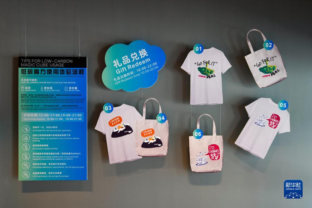 這是7月16日拍攝的“低碳魔方”使用體驗流程信息牌及可參與兌換的禮品。