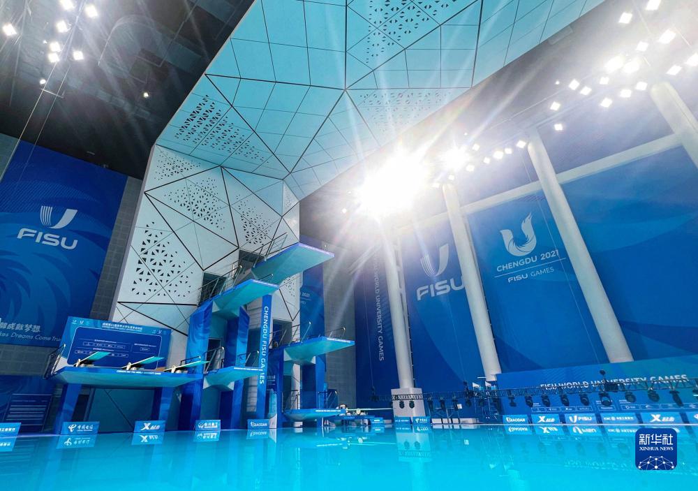 7月22日拍攝的簡(jiǎn)陽(yáng)文體中心游泳館跳水臺,它是我國唯一一座多折面異型清水混凝土跳臺,經(jīng)久耐用且節約資源。簡(jiǎn)陽(yáng)文體中心游泳館是成都大運會(huì )跳水項目的比賽場(chǎng)館。