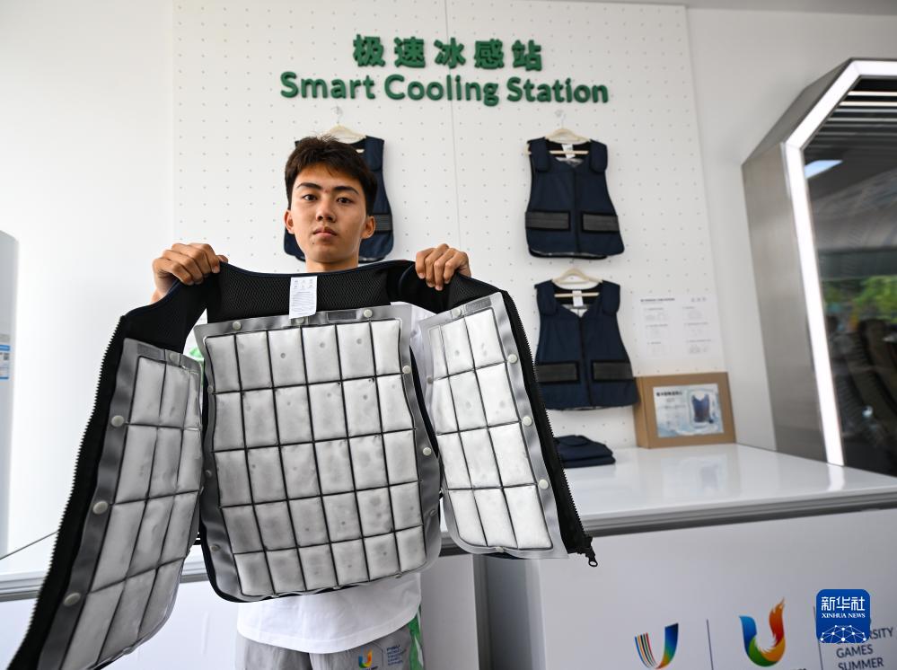 7月15日,在大運村科技服務(wù)工作站,工作人員在展示降溫冰背心。